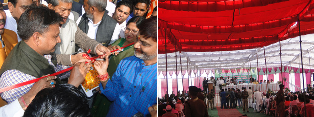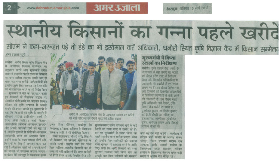 The Scientists of KVK and G B Pant University of Agri. & Tech., Pantnagar delivered lectures on scientific agriculture practices in the field of Agriculture, Horticulture and Animal Husbandry. The exhibition included the stalls of Line Departments such as Agriculture, Horticulture, Sericulture, Fisheries, Veterinary and Animal Husbandry, Sugarcane and Sugarcane Industry, UREDA, Jalagum, Organic Board, US &TDC. Other stalls included stalls of IFFCO, KRIBHCO, IIT Roorkee, 5 stalls from Farm Machinery, 2 stallls of Agricultural Implements, 6 stalls from Pesticides, 4 stalls of veterinary medicine. The farmers fair was attended about 1600 farmers. Hon’ble Chief Minister suggested that there should be all round development of the farmer’s community. He said that at present District Haridwar is in No 2 position in Food Production in State and suggested that farmers and Agriculture should work to place district haridwar at First position in Food Production. He suggested that farmers should be given short duration vocational trainings on backyard poultry, Bee Keeping, mushroom production, Dairy Farming, Nutritional Garden, Candle making, Vermi Compost and soil testing.